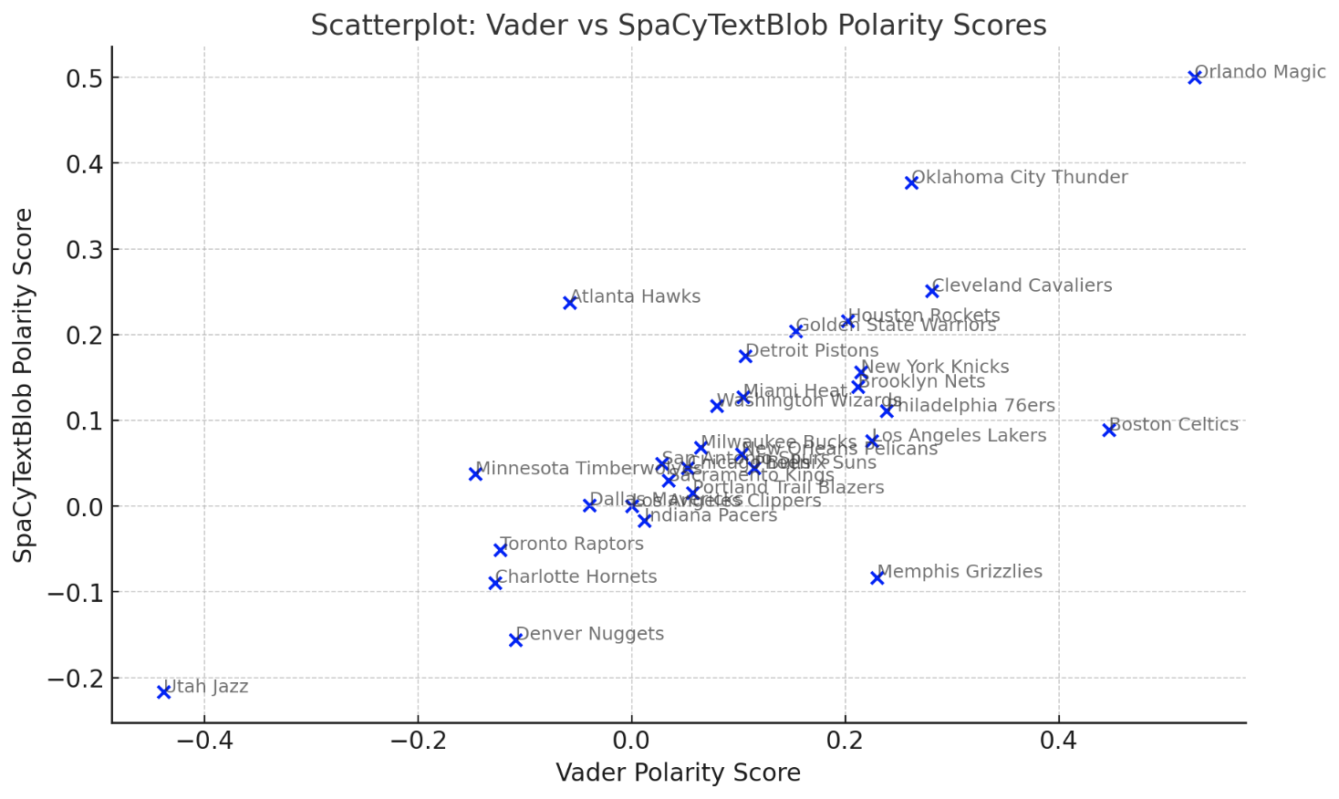 Another important thing to look at was that VADER had a wider range of scores, with way larger positive and negative values. For example, the Boston Celtics received a high VADER score of 0.4764, significantly higher than their SpaCyTextBlob score of 0.0671. These results can tell us that VADER was more sensitive to emotional language such as opinions, which may not always give off the intended sentiment of the article. Sports articles often emphasize dramatic language to get readers to read the articles, and VADER’s tool has the tendency to not take into account these tones which leads to extreme sentiment scores whether that be negative or positive. SpaCyTextBlob’s more balanced methods avoided these exaggerated scores and better showed the neutral tone that was actually in these articles. Negative sentiment scoring was another area where SpaCyTextBlob outperformed VADER. Teams like the Utah Jazz and Toronto Raptors received negative scores from both tools, but SpaCyTextBlob’s results better aligned with what was expected of the scores. The Utah Jazz had a SpaCyTextBlob score of -0.0750, while VADER gave them a more extreme score of -0.2202. Similarly, the Toronto Raptors had a score of -0.0509 with SpaCyTextBlob compared to -0.1235 with VADER. Both tools detected negative sentiment, but VADER’s exaggerated negativity score was too extreme taking in the context of the articles and what they consisted of. In my own review of articles discussing these teams, the language was often critical but not very negative like the VADER score suggested. SpaCyTextBlob’s moderate scoring better showed and displayed what the articles actually consist of.