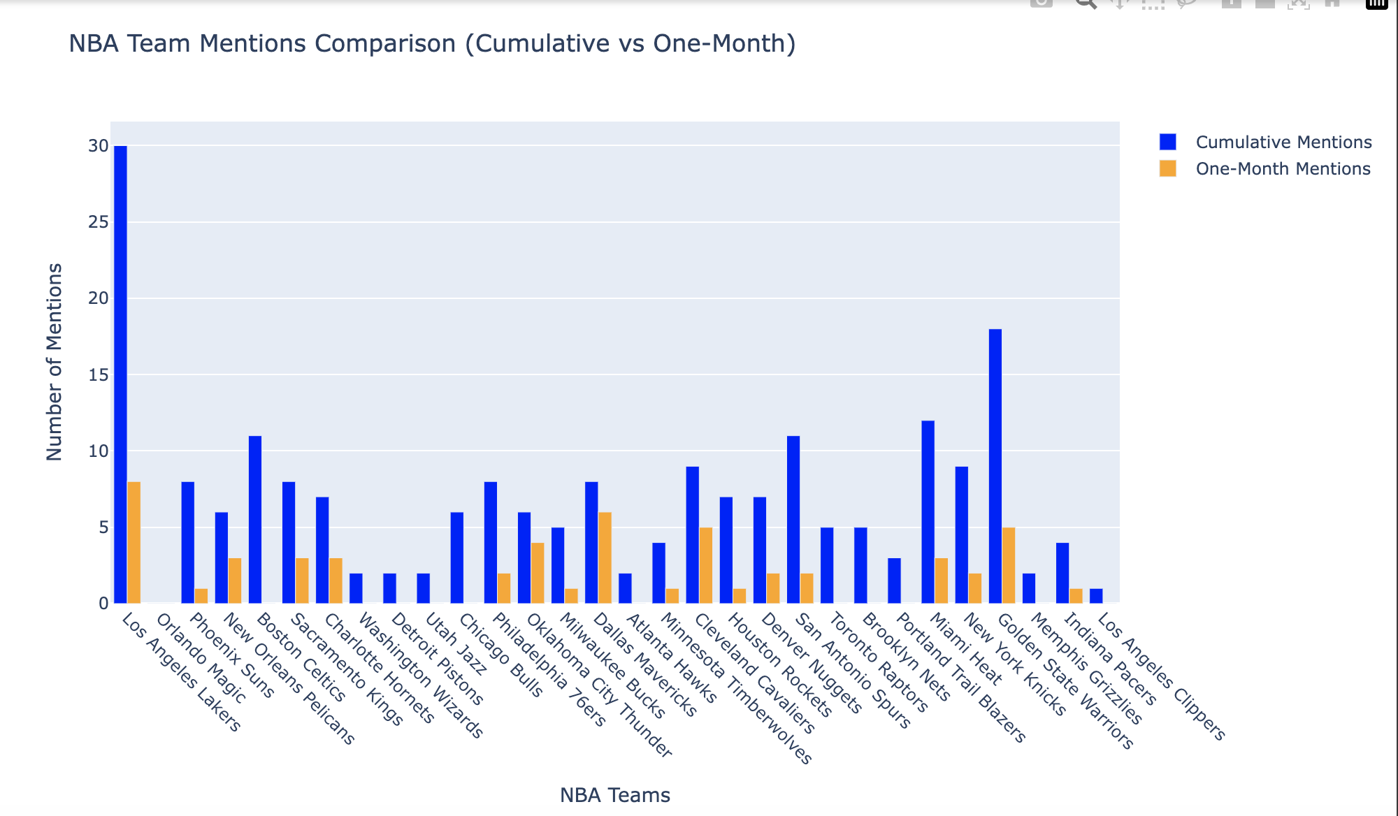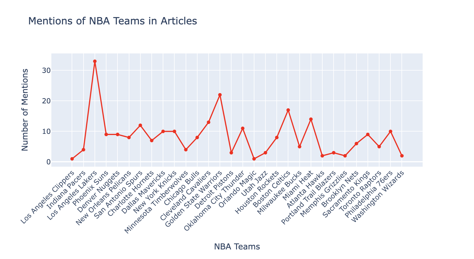 For this project, I utilized Plotly to create interactive visualizations that effectively present my data. Plotly is a powerful Python visualization library that allows for the generation of high-quality, interactive plots, making it ideal for my web-based dashboard. The key steps in constructing this graph were extracting NBA teams and their respective sentiment scores, using go.Bar() to generate a bar trace where the x-axis represents the team names and the y-axis represents their average sentiment scores, and customizing the chart with the correct labels, titles, and an angle adjustment for x-axis labels to make sure that the graphs are readable. This resulted in a bar chart that allows users to quickly compare how different teams are perceived based on sentiment analysis. To visualize how frequently each NBA team was mentioned in the dataset of articles, I created a line chart using go.Scatter(). This chart follows a similar data extraction process: extracting the mention counts for each team, using go.Scatter() to generate a line plot incorporating markers for better visibility, and adjusting the layout to include the correct titles and label arrangements. The line chart allows users to track which teams are most frequently mentioned, helping to identify trends in NBA media coverage. One of the major benefits of using Plotly is its ability to export plots as JSON using plotly.io.to_json(). This feature allowed me to save my plots as JSON files, which I could then dynamically load into my web-based dashboard using JavaScript. The process involved converting each Plotly figure to a JSON string, saving these JSON objects to a file (plot_data.json), using JavaScript’s fetch() function to retrieve and parse the JSON data in an HTML file, and rendering the graphs in the browser using Plotly.newPlot(). This method made sure that my visualizations remain interactive and can be updated dynamically without requiring the user to re-run the Python script. Plotly offers several advantages over traditional static plotting libraries. The interactive nature of the graphs allows users to hover over data points, zoom in/out, and explore data trends more effectively. Additionally, its compatibility with both Python and JavaScript enables me to easily integrate it with web applications, making it an excellent choice for my project. Below is an example of what the graphs look like on the dashboard.