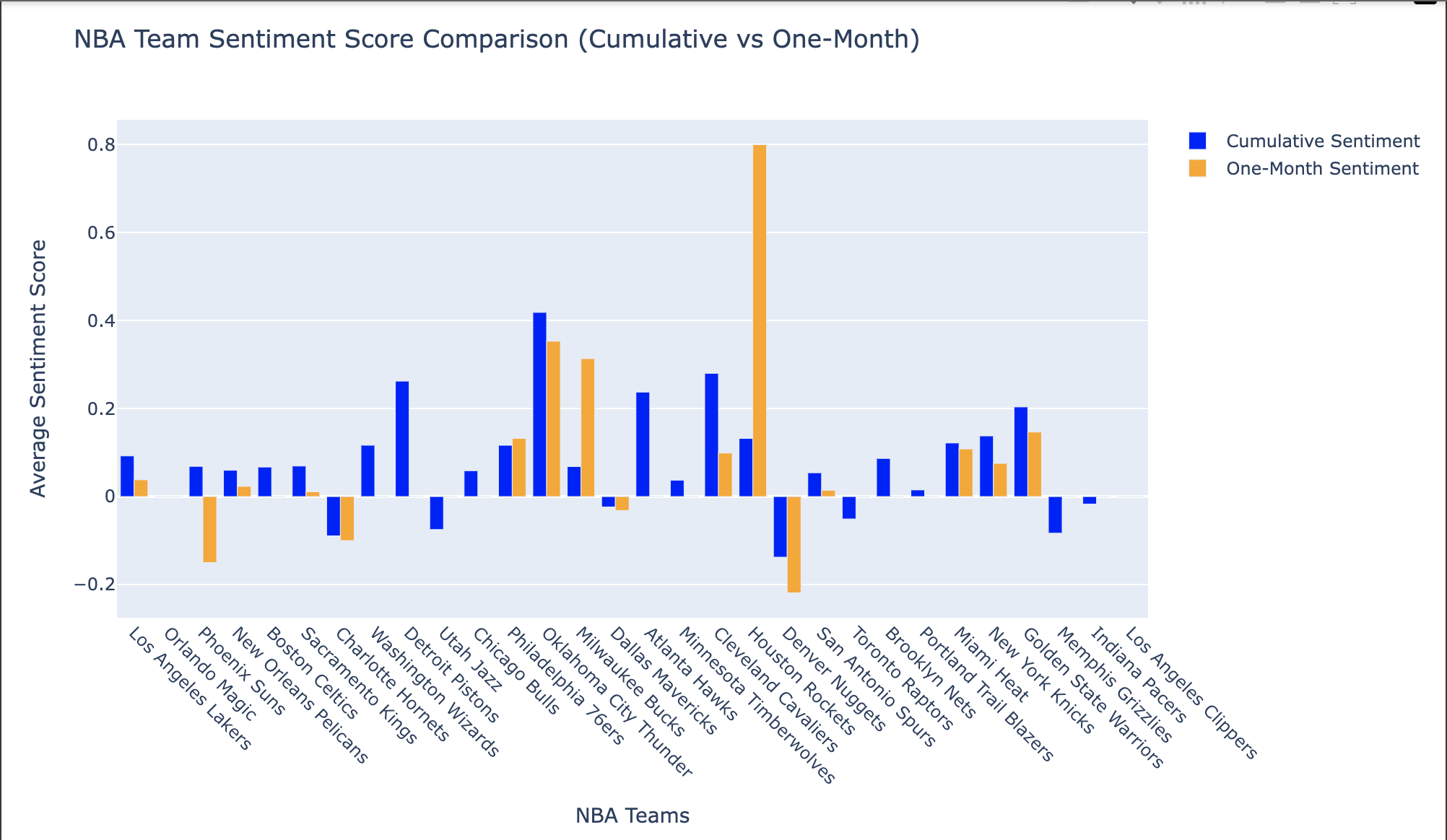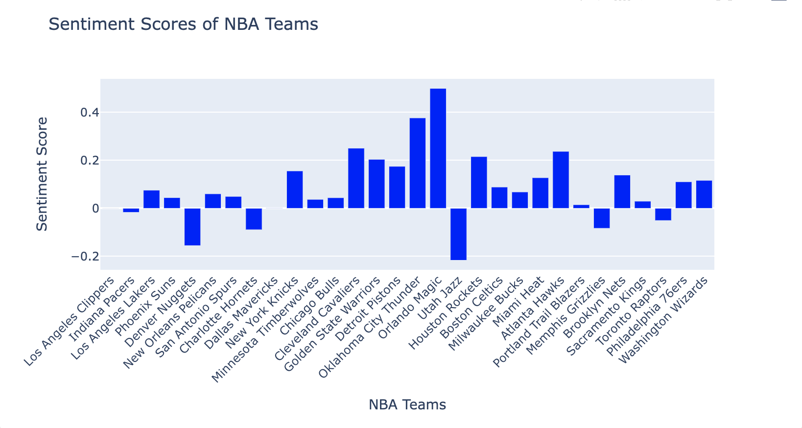 Additionally, introducing analysis of sentiment over time would provide new findings into how media sentiment shifts over time in the NBA. Tracking sentiment analysis patterns across multiple months or seasons could identify change in sentiment scores which could be linked to team performance, trades, or controversies. For example, a positive sentiment score might align with a winning streak, while a sentiment score decline could indicate a major team scandal or injury report. Implementing a time series visualization within Hoop-Hype’s dashboard would allow users to explore these changes dynamically which adds an important dimension to the analysis. Without knowing why a team’s sentiment score spiked really high or fell really low, it might seem like the media is just being biased for no reason, and something like this would identify the real media bias in the NBA by allowing users to see when sentiment scores were calculated.