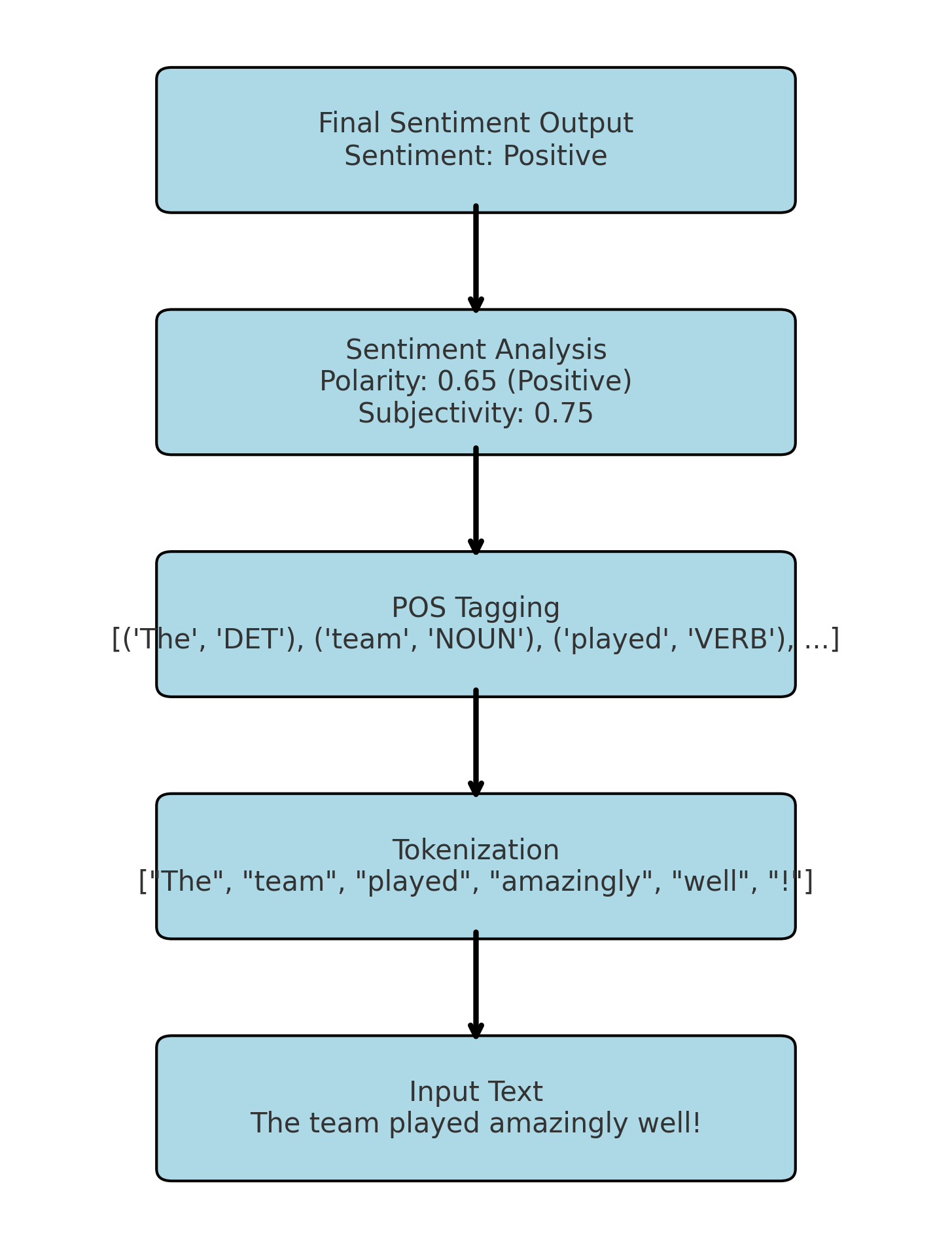 To analyze the sentiment of sports articles, this study utilizes two natural language processing (NLP) libraries: spaCy and TextBlob. spaCy is a strong NLP library created for text processing, while TextBlob provides a simple API for performing various text analytics, including sentiment analysis. In particular, TextBlob is used to calculate the polarity score of text blocks, which measures sentiment on a scale from -1 (highly negative) to 1 (highly positive), with 0 indicating a neutral sentiment[15]. TextBlob’s sentiment analysis is powered by the Natural Language Toolkit (NLTK) and uses a pre-trained lexicon-based approach, where words are assigned predefined sentiment values based on their polarity in a sentiment lexicon. The polarity of a given block of text is then calculated by averaging the sentiment scores of individual words, considering their contextual weight and intensity modifiers. When looking at a word, it considers factors such as whether the word has increasing intensity (e.g., “very good” vs. “good”) or whether it is negated by surrounding words (e.g., “not bad” vs. “bad”). Additionally, TextBlob assigns a subjectivity score ranging from 0 (objective) to 1 (highly subjective), which indicates the degree to which a text expresses opinion rather than factual information. The sentiment analysis method in TextBlob relies on the Pattern library’s lexicon, which is based on a combination of machine learning and rule-based heuristics to determine sentiment values [15]. Below is an example of the flow of how Textblob works, and how it produces the polarity score and the subjectivity score. Textblob starts by taking in a piece of text of any size: in this case, it is a smaller piece of text. The next step is the tokenization step where you can see how Textblob breaks up the text as a whole and creates tokens of the individual characters. The next step is the POS or part of speech tagging where the algorithm will tag each token with a grammatical category. After that, each token is then given a polarity score based on a predefined sentiment lexicon. Lastly, as you can see in the diagram/flow chart below, the sentiment is calculated and the input text is finally given a polarity score and a subjectivity score. In this particular case, for this study, the only thing that is needed is the polarity score so that is what is extracted from the Textblob model and used for analysis. Below is a visual representation of the workflow and steps that Textblob goes through to get a polarity score from a section of text.